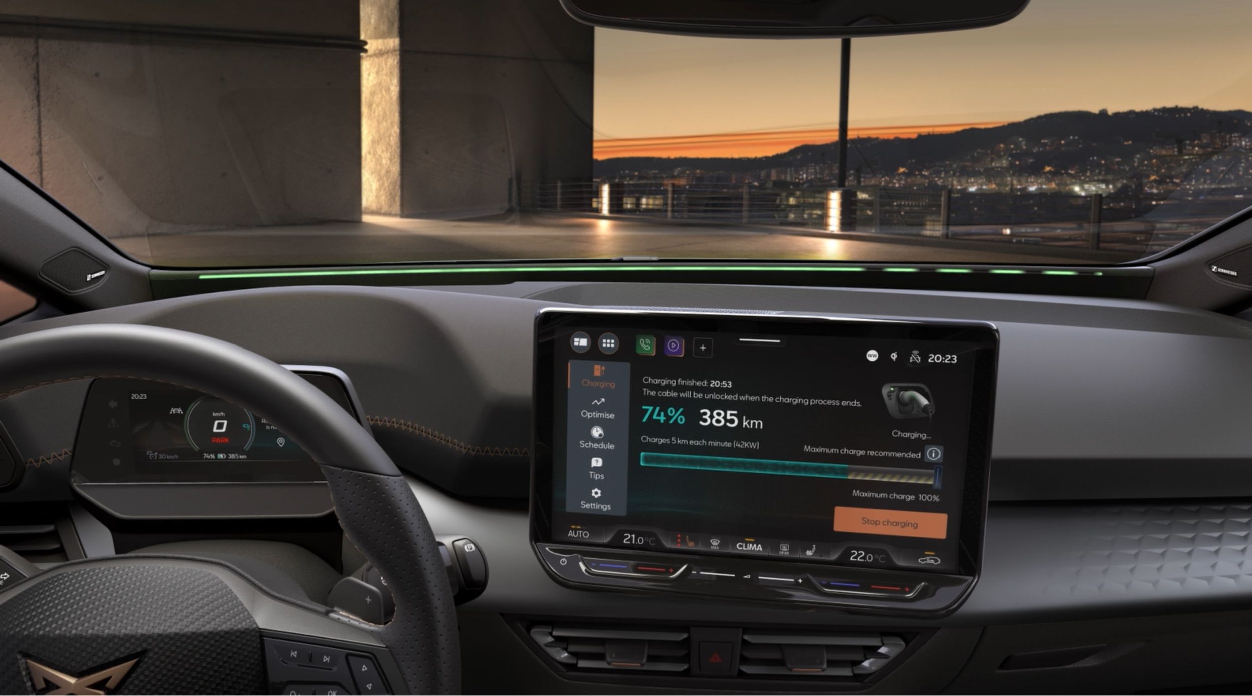 Das Interieur überzeugt mit hochwertiger Verarbeitung, sportlichen Details und modernen Funktionen. Der Fahrer blickt auf ein 12,9" Infotainmentsystem mit Sprachsteuerung, digitale Instrumente und CUPRA Drive Profile zur individuellen Fahrmodusanpassung.